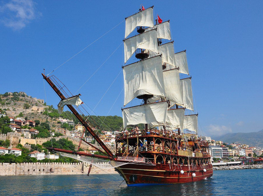 ⏳ Departure from Alanya Harbor: Step aboard our legendary pirate vessel as we set sail from the historic harbor, passing the majestic Seljuk Shipyard.